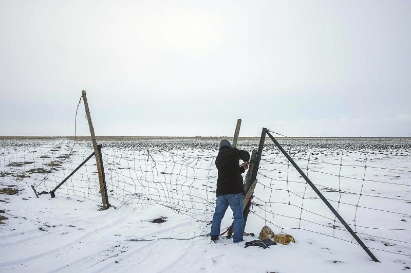 3月6日,若尔盖湿地国家级自然保护区管理局生态护湿员如科冒雪清理栖息地周边的隐患。