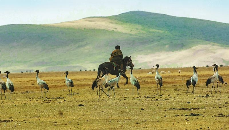 3月6日,今年的第一批黑颈鹤比往年提早了半个月飞回若尔盖湿地,大草原上呈现出人与珍稀鸟类和谐共处的温馨画面。