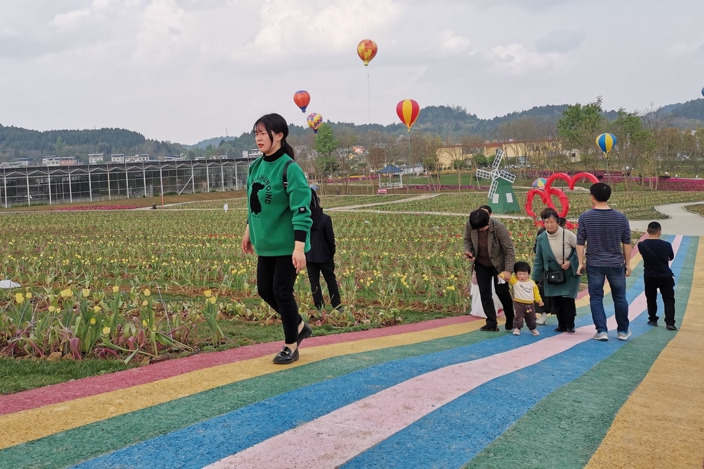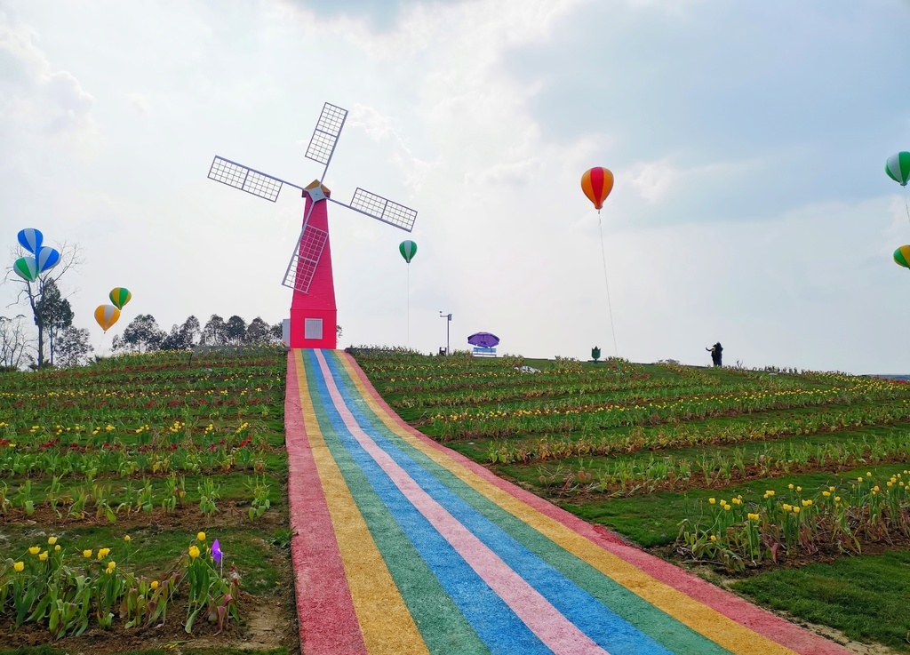 3月18日,走进遂宁蓬溪县天福万象国际农业博览园,15万株各色郁金香热情洋溢,色彩斑斓的热气球和风车建筑,犹如童话世界。