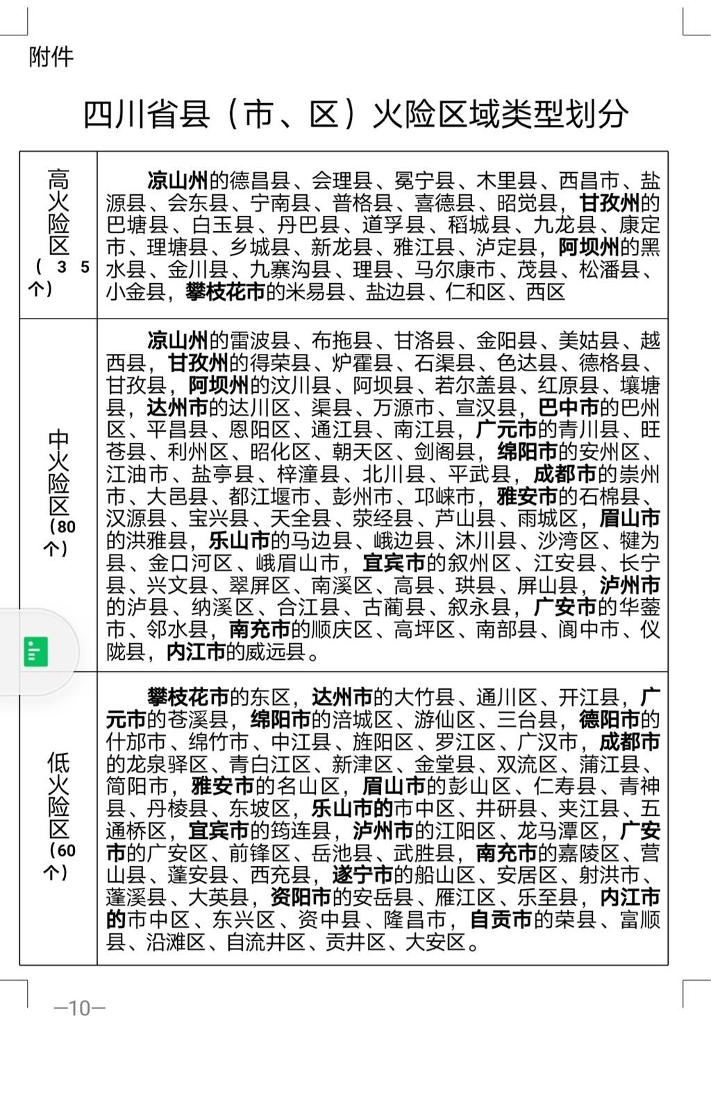高火险区有35个县(市、区),全部分布在甘孜州、阿坝州、凉山州和攀枝花市;中火险区有80个县(市、区);低火险区有60个县(市、区)。详见后文。
