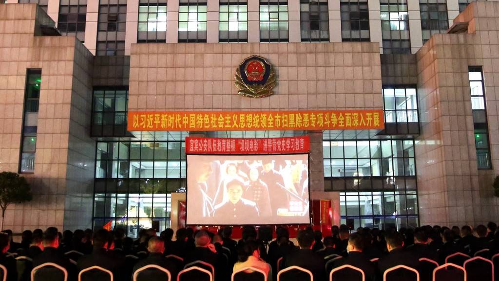 3月23日晚,宜宾市公安局大院坝里200余名公安民辅警围坐在一起,利用下班时间,全神贯注地观看爱国主义电影《建党伟业》。宜宾市公安局以这样的方式举办队伍教育整顿“坝坝电影进警营”党史学习活动。