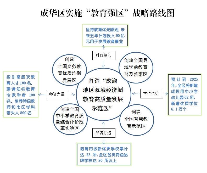 教育是国之大计、党之大计。成华区委围绕建设“教育强区”的发展目标,提出到2025年,该区教育综合实力将迈入“中西部领先、全国一流”的行列,创建全国义务教育优质均衡发展区,建成在全国具有重要影响力的“成渝地区双城经济圈教育高质量发展示范区”,为推动成华“1556”总体发展思路全面落实提供人才支撑,助力成渝地区双城经济圈建设。