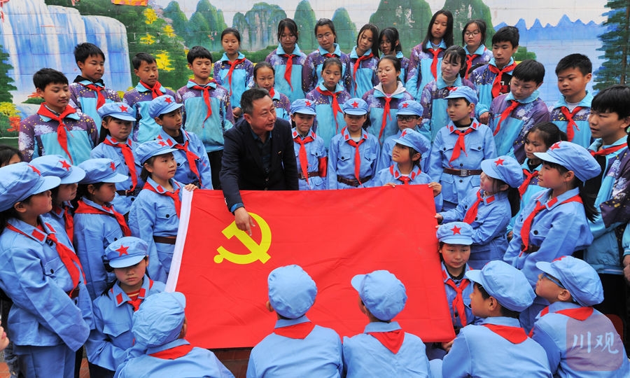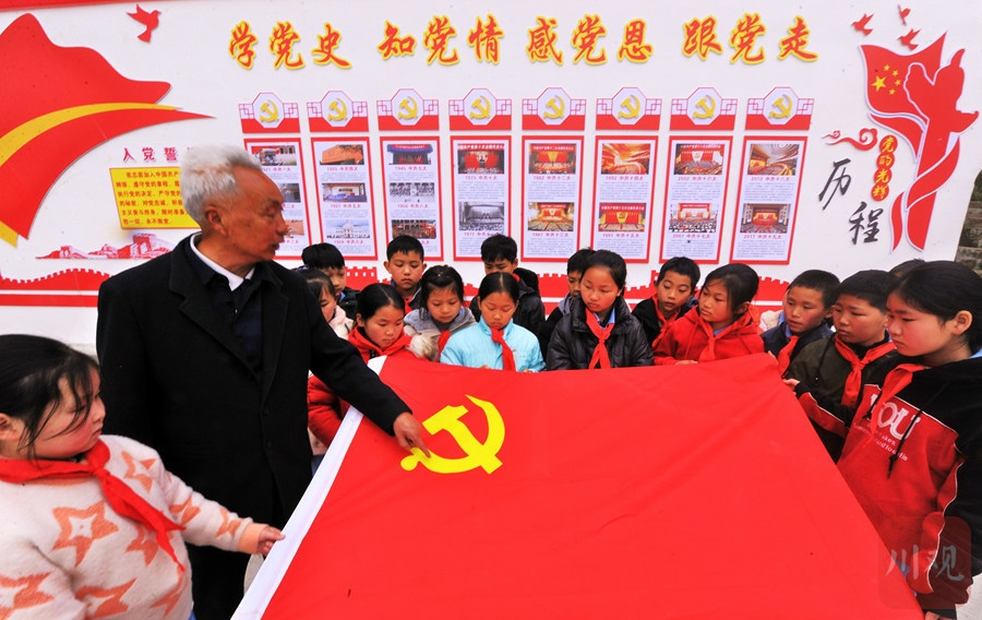 巴中市南江县双流镇九年义务教育学校五年级少先队队员在郑家洞山洞博物馆门口听取老党员、退休教师陈喜朝讲授党旗故事。