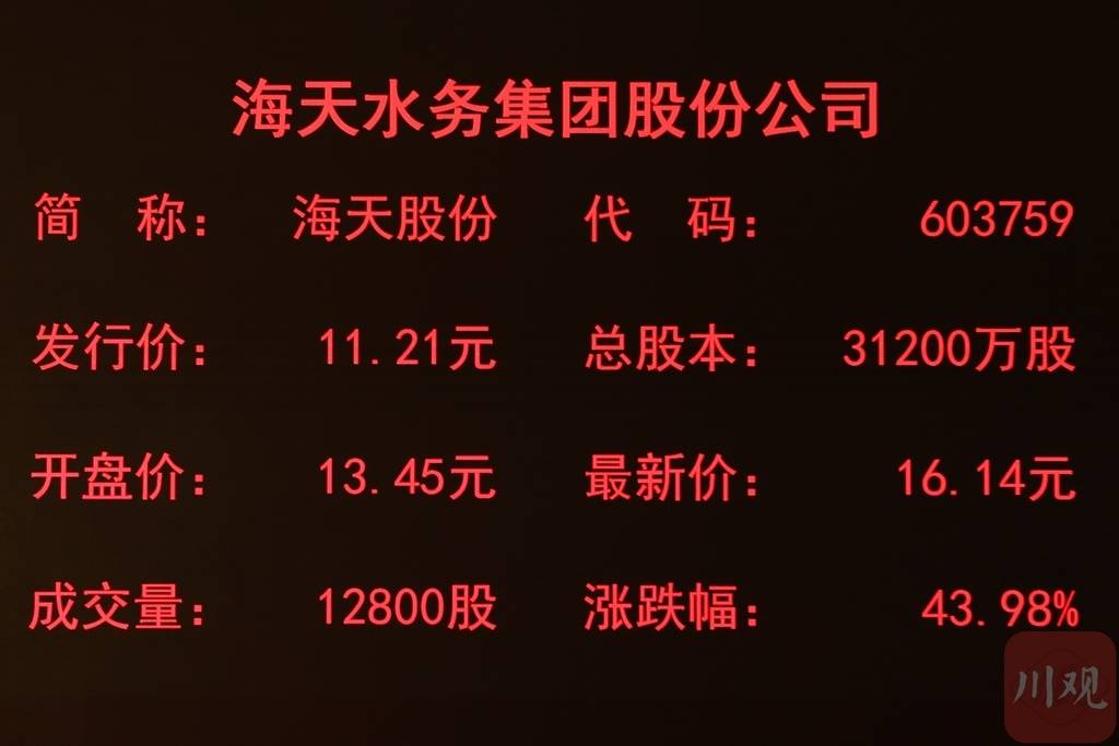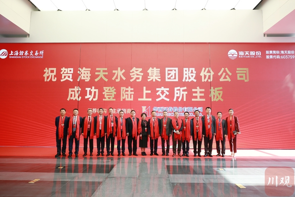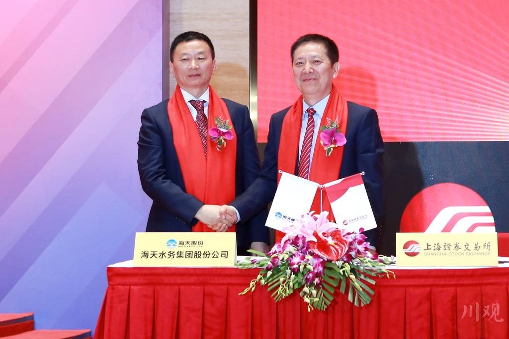 3月26日,上海证券交易所,交易大厅大屏幕上“热烈祝贺海天水务集团股份公司成功登陆上交所主板”的字幕格外醒目。上午9时28分,伴随着一声清脆的锣响,海天水务集团股份公司(下称“海天股份”)顺利登陆A股主板市场,在上海证券交易所挂牌上市,股票简称“海天股份”,股票代码:603759,成为2021年四川首家A股主板上市的企业,也是四川天府新区首家在上海证券交易所主板上市的企业。