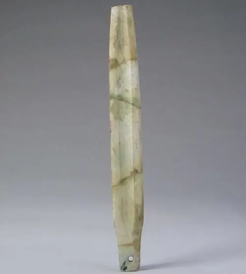 ▲玉剑 残长28.2厘米,宽3.4厘米。前锋残断,剑身呈竹叶片状,剑身一面凸起,另一面两侧平,中间呈弧形下凹。扁茎无格,茎上有一圆穿。玉制的剑目前在全国仅此一件,其形状与后来在四川地区广为流行的一种青。