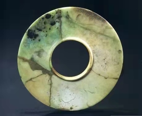 ▲玉璧 外径17.8厘米,孔径6.7厘米。各组同心圆之间的距离相等,显然经过精确的计算,阴线纹线条均匀流畅,表现出极其高超的冶玉技术。