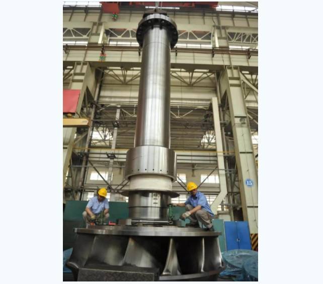 ▲水轮机主轴及转轮 是水轮发电机组转动部分的重要部件,该机组为改造机组,转轮共15件叶片,最大外圆直径达2.1米,总高1.03米,精加工后净重约6.65吨;主轴总长4.16米,最大回转直径1.04米。