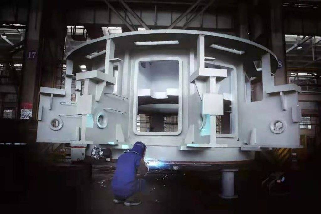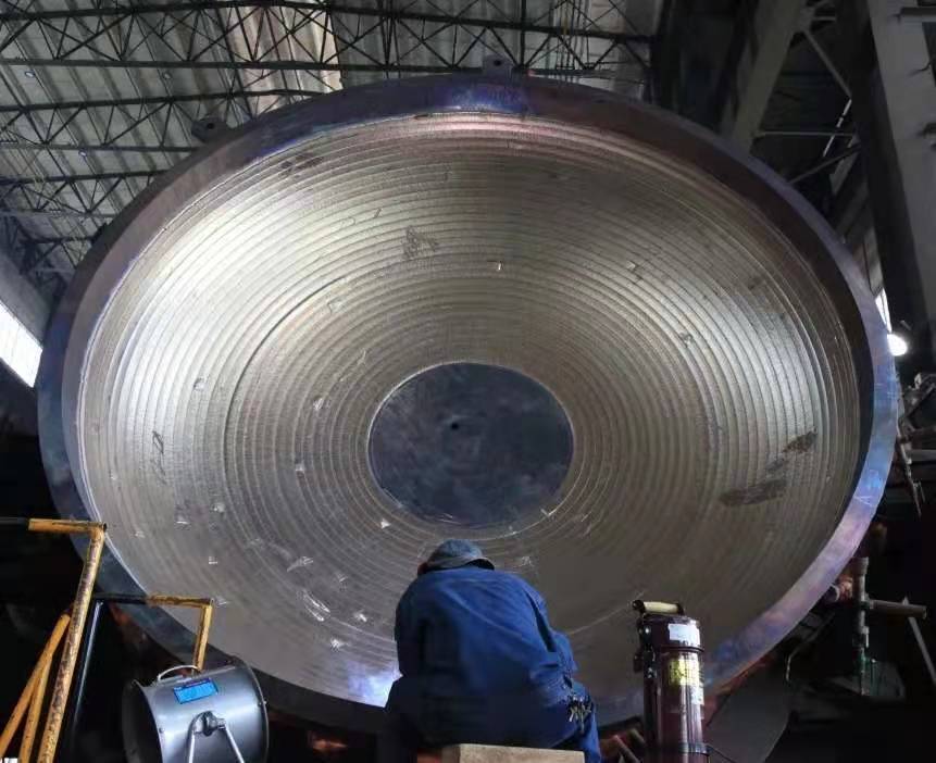 ▲安注箱封头 核电项目安注箱部件之一,内径3.5米,外径3.66米,采用合金钢压制成型,内壁堆焊不锈钢,用于产品的密封。
