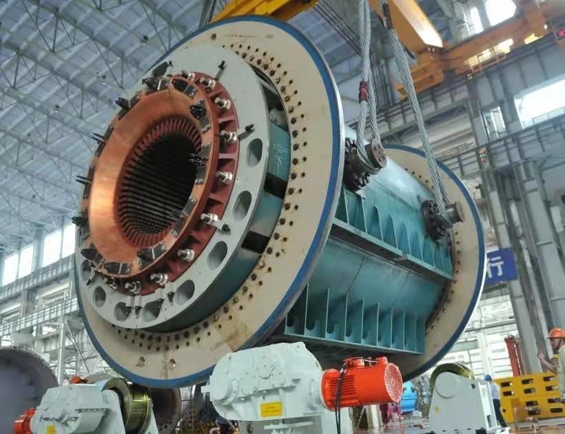 ▲发电机定子 汽轮发电机定子的主要作用是产生旋转磁场,帮助转子在旋转磁场中被磁力线切割,进而产生电流。