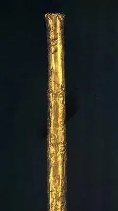 ▲黄金权杖 是已出土的中国同时期金器中体量最大的一件。长143厘米,直径2.3厘米,重463克。金杖是用金条捶打成金皮后,再包卷在木杖上的。