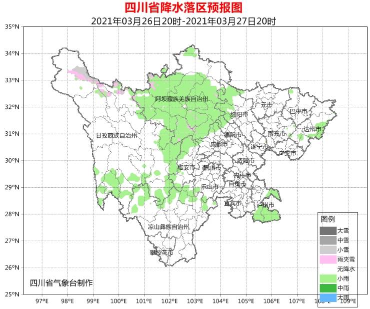 3月27日白天,盆地大部多云间晴;阿坝州、甘孜州南部及凉山州背部多云间阴有分散阵雨(雪),川西高原和攀西地区其余地方多云间晴。