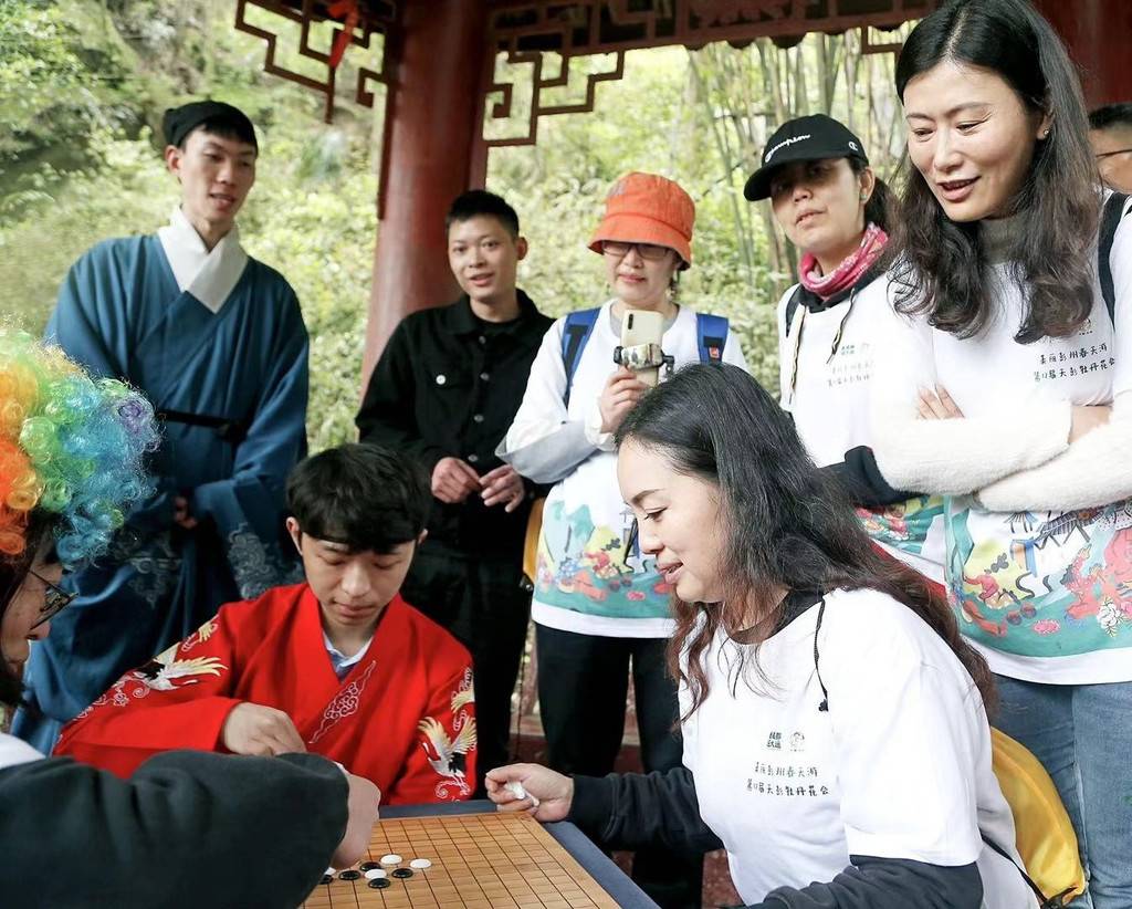 丹景山是国家4A级景区,自古就是“灵秀独钟”的蜀中名山,深受徒步登高者喜爱。启动仪式后,与会者集体从陆游祠出发走向丹景山景区腹地,沿途饱览牡丹美景。此次徒步活动全程总计约3.2公里,途中还设置了棋局对弈、古风投壶和“飞花令”挑战等互动游戏,所有参赛者自由选择任务挑战,行至终点根据完赛情况还可获得相应小礼品。
