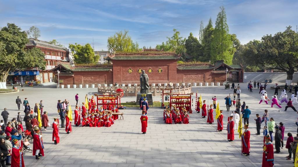 开庙礼主持人介绍到:“夫子之墙数仞,不得其门而入,不见宗庙之美,百官之富……圣人之德,与天地叁。圣人之道,纵贯古今……本州文庙,宫墙万仞,贤关其左,圣域其右。入此门墙,文脉长继。”依次向孔子塑像上香行礼。在“有朋自远方来,不亦乐乎”的主持声中,崇庆中学礼乐团的学生奏响礼乐迎宾曲,州文庙缓缓启门开庙,迎接游客有序入内。5月1日前,崇州文庙试行每周六、周日行开庙礼。待人员充足后实行每日行礼开庙,并为游客预留参与体验的名额。此举就为崇州打造出一道独特的城市人文景观。