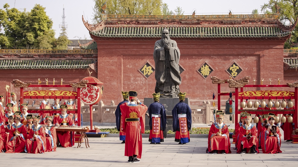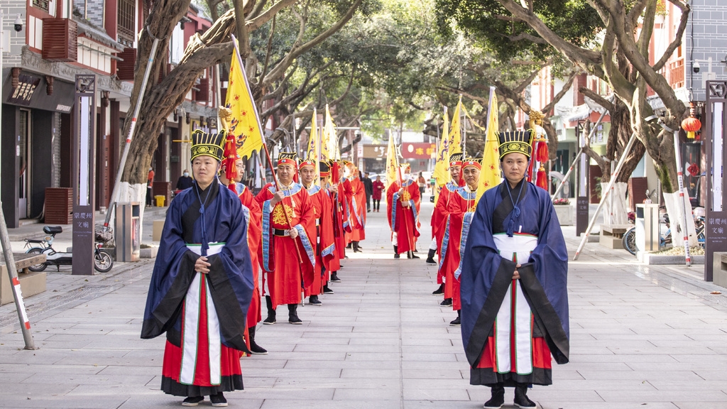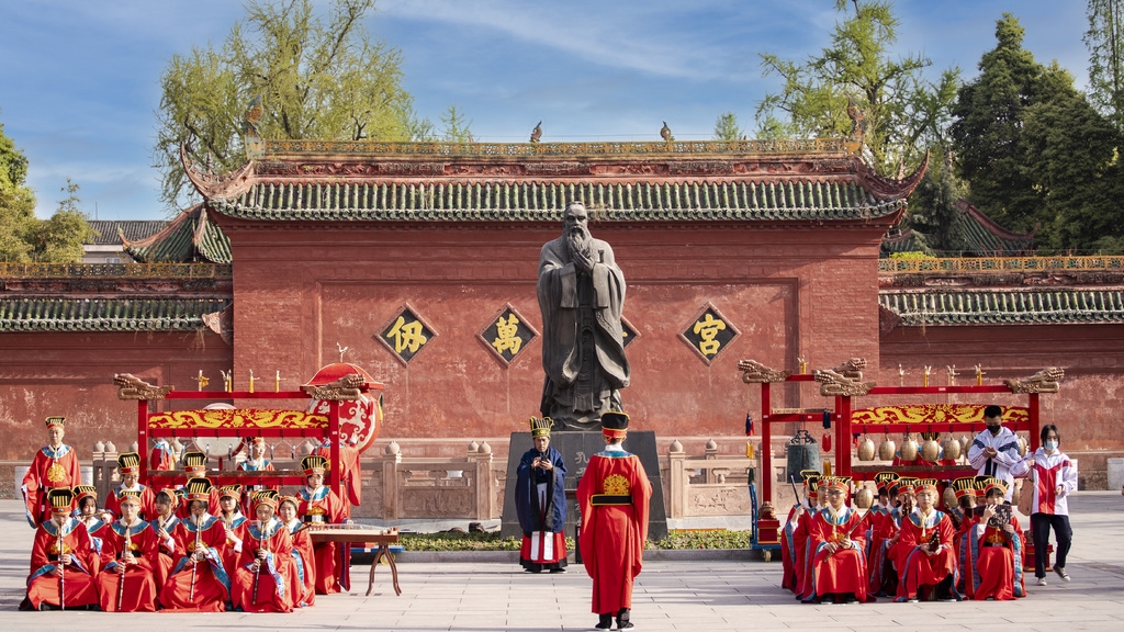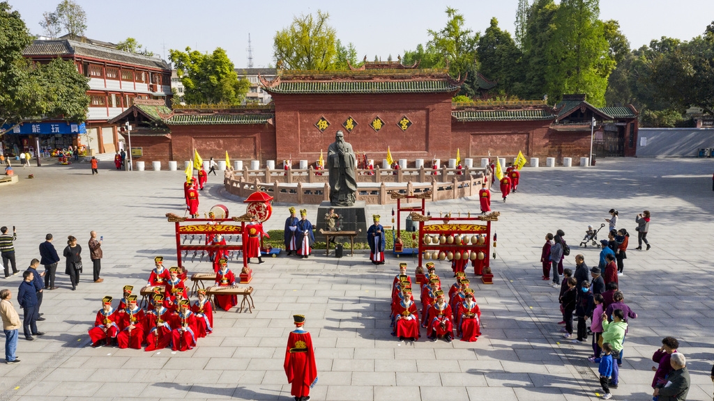 3月28日,崇州文庙举行首次开庙礼,在庄重的仪式中行礼开庙。孔子广场孔子塑像前钟鼓齐鸣、旗戟绕场。