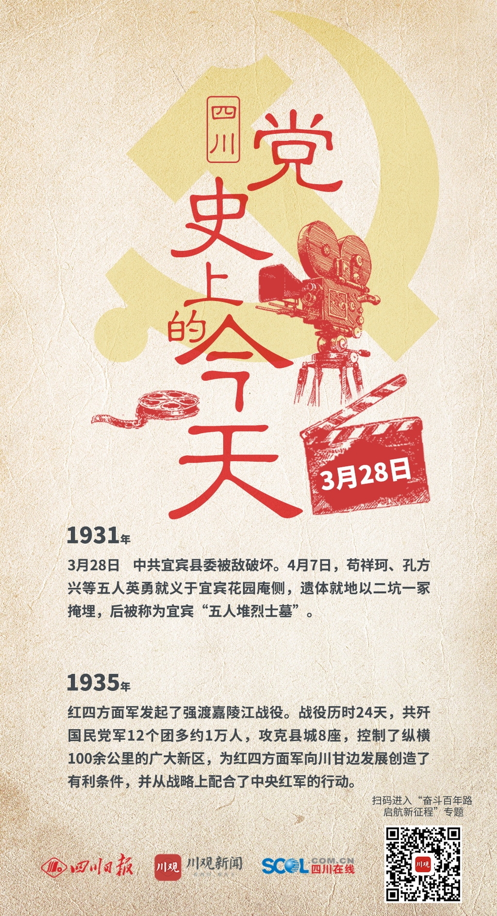 1931年3月28日 中共宜宾县委被敌破坏。4月7日,苟祥珂、孔方兴等五人英勇就义于宜宾花园庵侧,遗体就地以二坑一冢掩埋,后被称为宜宾“五人堆烈士墓”。