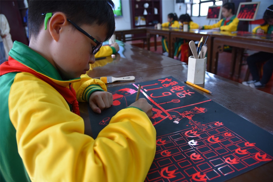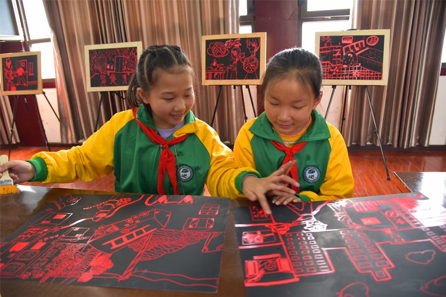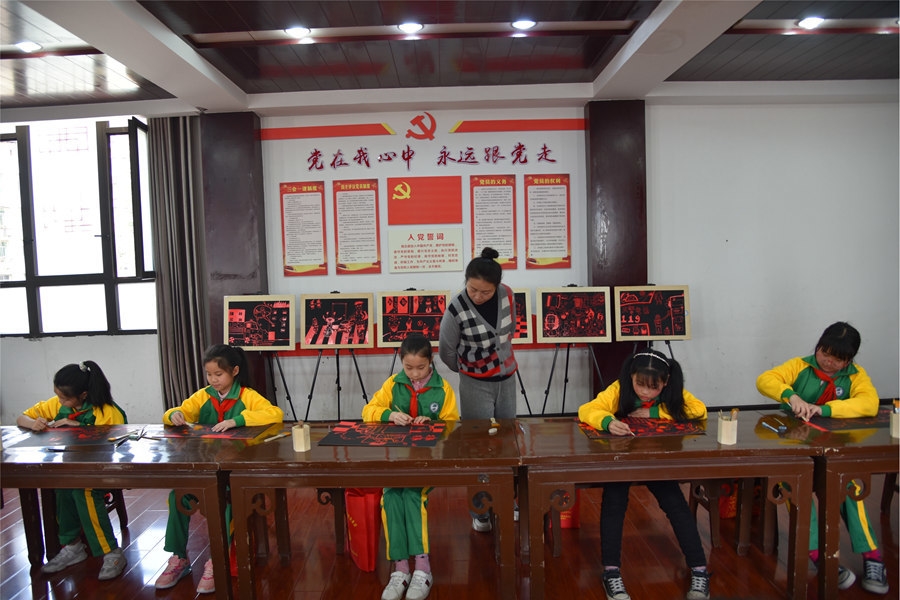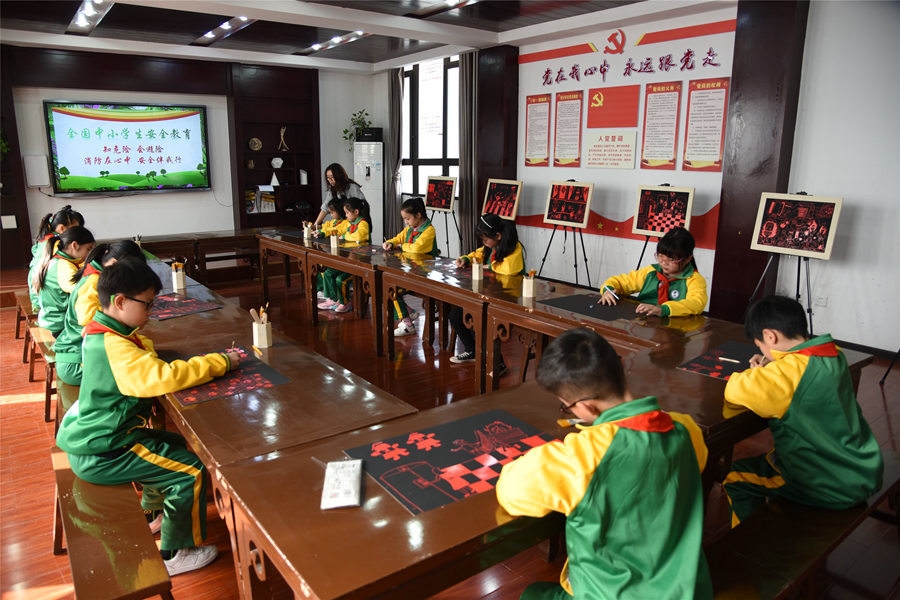 威远县河北街小学,师生们将安全主题与刮画这一艺术载体相结合现场进行创作。
