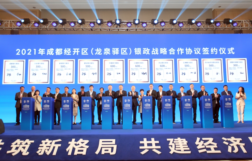 活动现场,成都经开区管委会与中国工商银行等近30家金融机构签署银政战略合作协议,相关金融机构将在“十四五”期间为成都经开区(龙泉驿区)实体企业发展、片区开发、城市有机更新、乡村振兴和幸福美好生活十大工程等方面提供超5000亿元金融意向授信。