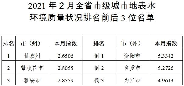 3月30日,四川省生态环境厅召开新闻发布会,会上通报了今年2月全省地表水质量排名情况,根据通报,今年2月,四川21个市级城市地表水环境质量较好的前3名依次为甘孜州、攀枝花市、雅安市;地表水环境质量较差的后3名依次为资阳市、自贡市、内江市。