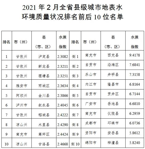 县级城市排名情况方面,今年2月,四川183个县级城市地表水环境质量较好的前10名依次为泸定县、新龙县、理塘县、雅安市雨城区、金川县、叙永县、稻城县、木里县、南充市高坪区、甘洛县;地表水环境质量较差的后10名依次为西充县、自贡市沿滩区、井研县、隆昌市、自贡市贡井区、岳池县、仪陇县、邛崃市、安岳县、梓潼县。