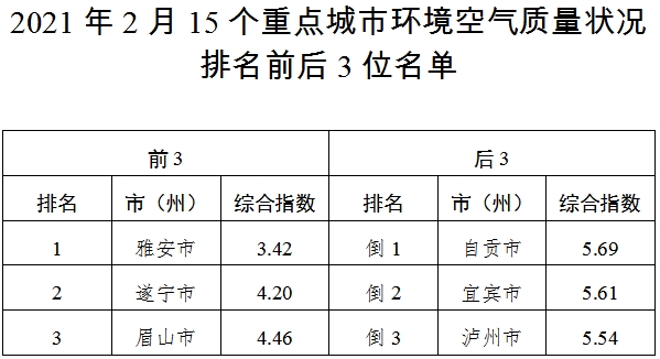 今年2月,四川15个空气质量重点城市(2015年未达标城市)中空气质量较好的前3名依次为雅安市、遂宁市、眉山市,空气质量较差的后3名依次为自贡市、宜宾市、泸州市;空气质量恶化程度较重的前3名依次为泸州市、宜宾市和内江市(并列)。这是记者3月30日在四川省生态环境厅召开的新闻发布会上获悉的。