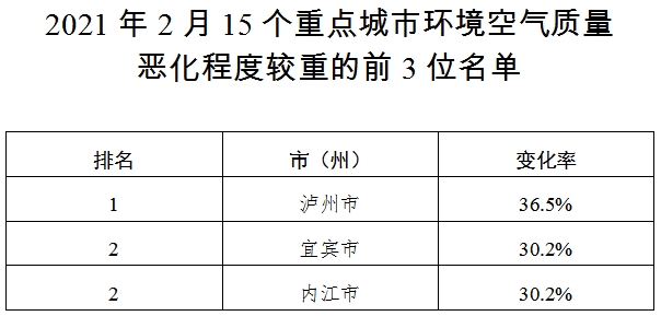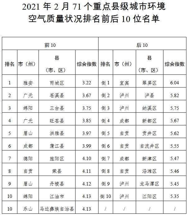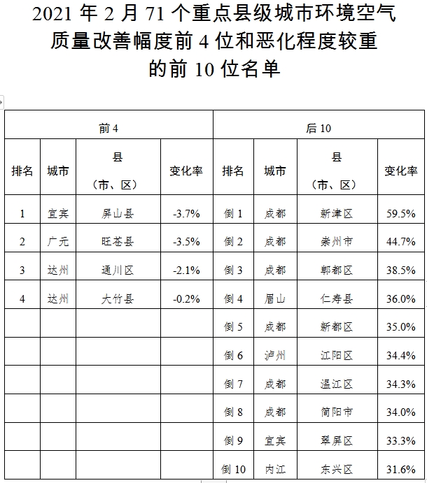 今年2月,在四川71个重点县级城市中,空气质量较好的前10名依次为雅安市雨城区、苍溪县、三台县、旺苍县、洪雅县、蒲江县、德阳市旌阳区、荣县、丹棱县、江油市和马边彝族自治县(并列),空气质量较差的后10名依次为宜宾市翠屏区、泸县、泸州市纳溪区、成都市新都区、自贡市贡井区、自贡市自流井区、成都市新津区、自贡市沿滩区、泸州市龙马潭区、泸州市江阳区。空气质量改善幅度前4名依次为屏山县、旺苍县、达州市通川区、大竹县;空气质量恶化程度较重的前10名依次为成都市新津区、崇州市、成都市郫都区、仁寿县、成都市新都区、泸州市江阳区、成都市温江区、简阳市、宜宾市翠屏区、内江市东兴区。