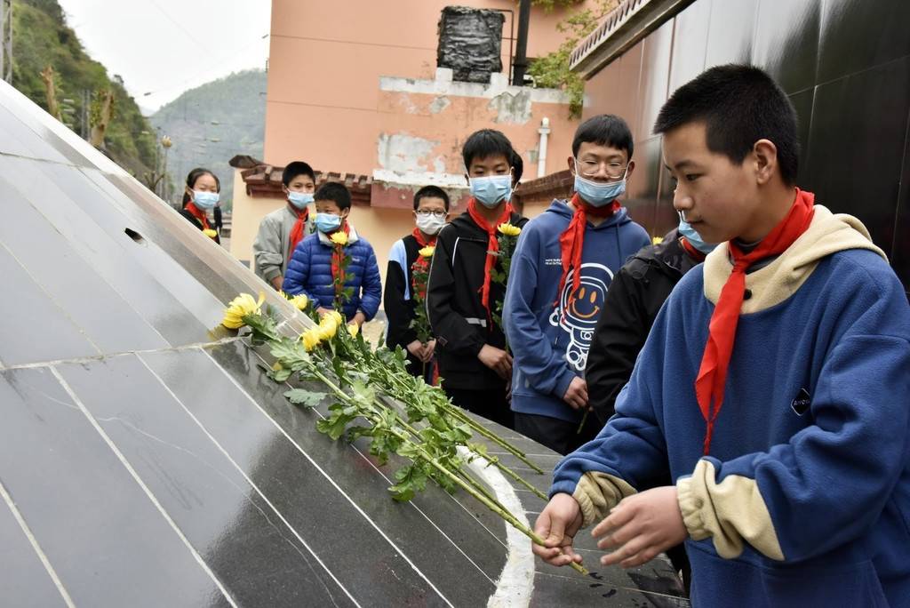 3月30日,清明节到来前夕,广元市朝天区大滩镇全体党员干部、大滩派出所全体干警、以及大滩中学学生,在烈烈党旗的指引下,一路追随烈士曾经的足迹,来到唐业成墓前。