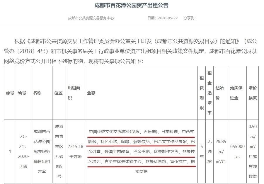 但记者在成都市公共资源交易服务中心上查到的信息却与这一说法有出入。2020年5月,成都市百花潭公园发布了一份资产出租公告,该公告明确:兰园等场所的经营范围,主要是传统文化交流体验、盆景制作销售、咖啡、简餐等,慧园的经营范围则包括巴金文学作品展馆、巴金讲堂等,“农夫问道”“南寻歌”这类消费较高的餐饮店项目均未列入经营范围。