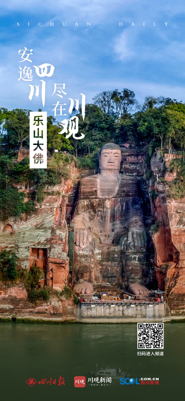 “世界物质与文化遗产”乐山大佛景区旅游局副局长吕丹站在已“保养”完毕的大佛旁边,祝贺旅游频道上线成功、越办越好。