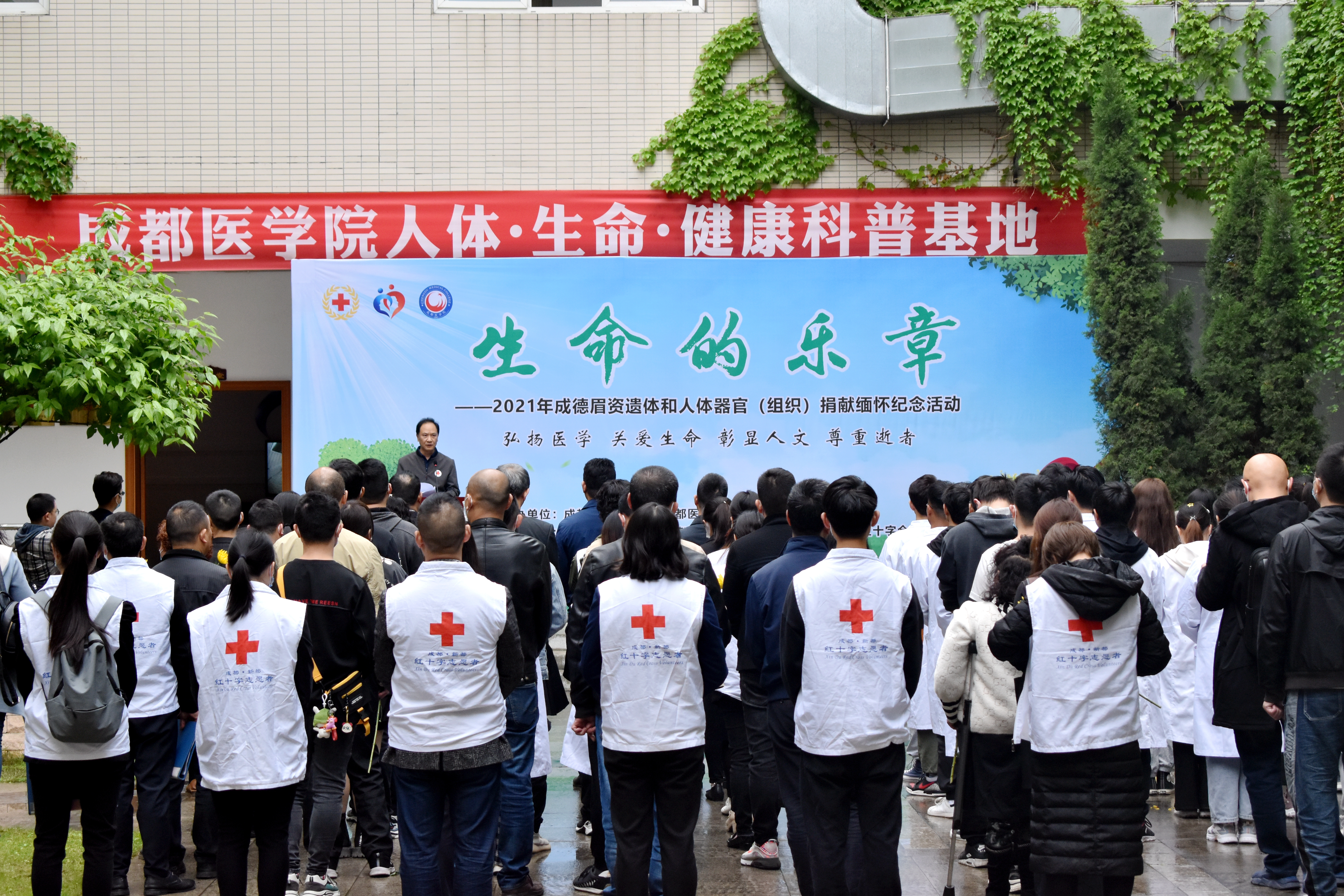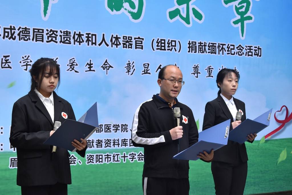 据了解,学校每年清明节前都会举行致敬“无语老师”活动,感恩致敬遗体捐献志愿者及其家属的无私奉献,2021年的主题是“生命的乐章”——致敬遗体及器官捐献志愿者缅怀活动,由成都医学院,成都市、新都区、德阳市、眉山市、资阳市、绵阳市等地红十字会联合举办。学校师生、遗体器官捐献登记者和家属、各地红十字会志愿者及工作人员等近百人参与活动。