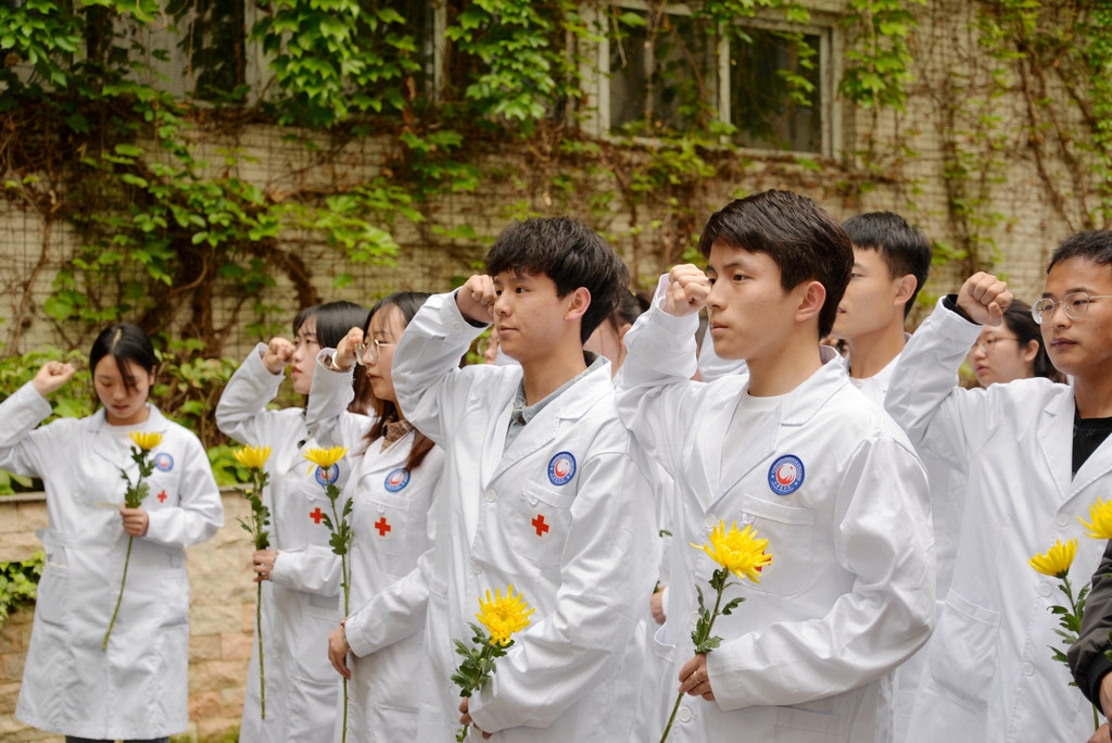 3月31日,成都医学院30多位师生肃立于成都医学院解剖楼馨香园里,在纪念遗体捐献者的无字碑前,举起右手,庄严宣誓,发扬捐献者大爱无私精神,献身医学,助人民健康之完美。