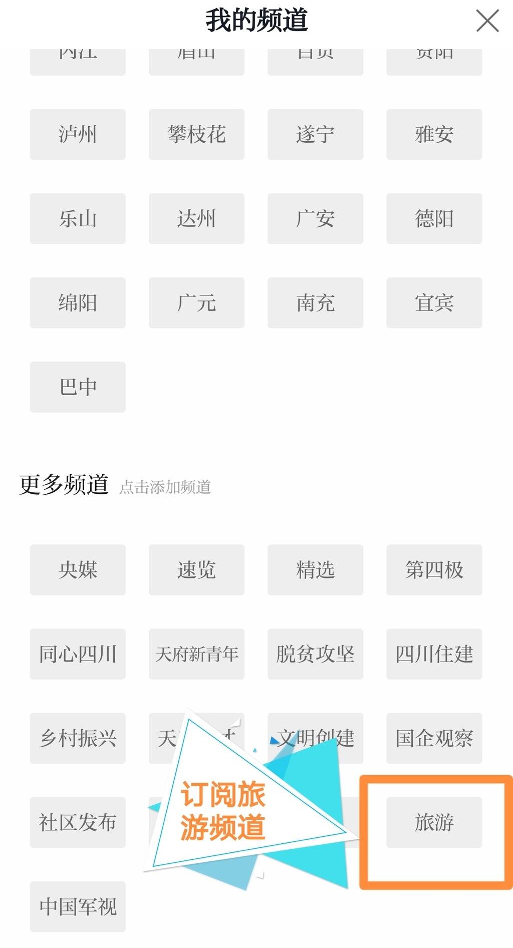 打开川观新闻客户端,进入首页,点击顶部频道栏,订阅“旅游”频道
