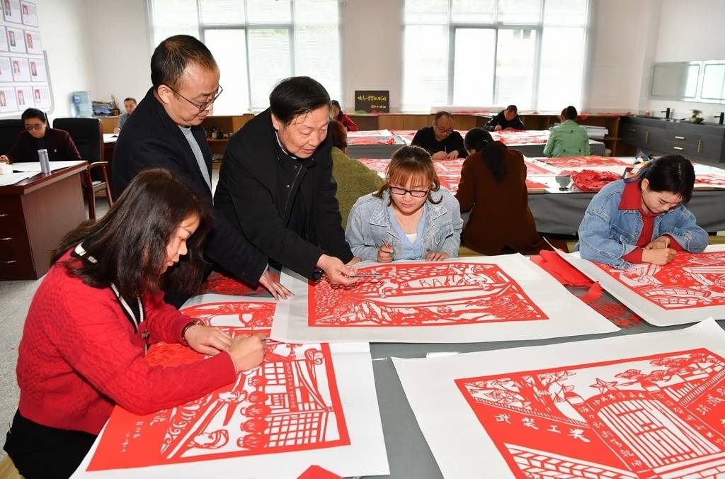 4月1日,非物质文化遗产“唤马剪纸”传承人李自鹏老师在现场指导。