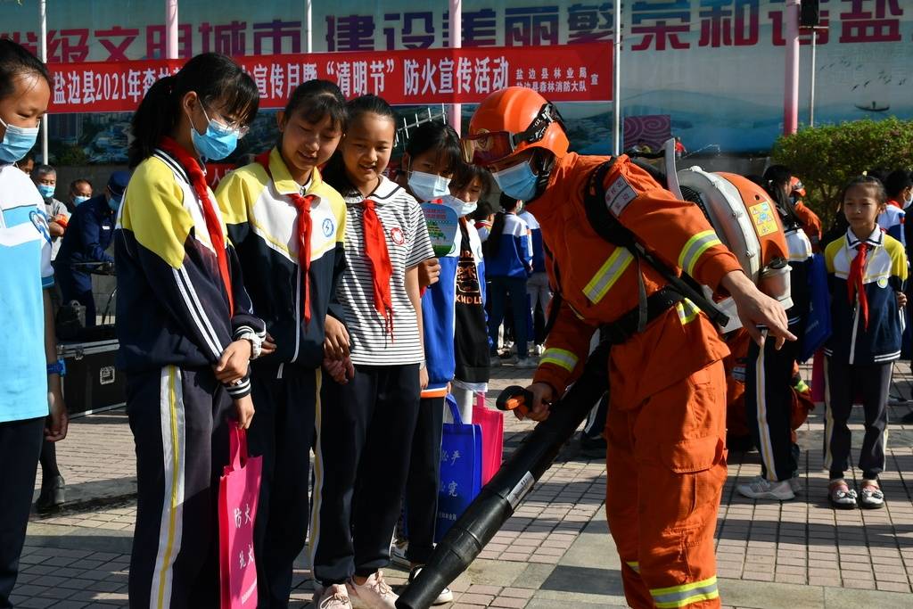 “哇,好大的风。”4月2日上午,攀枝花市盐边县文化广场,几十名中小学生围在一起,伸手感受机器吹出的风力。目光所聚,一位同学背上风力灭火机,以“身临其境”的方式学习森林草原放灭火知识。当天,盐边县举办了清明节防火宣传活动。