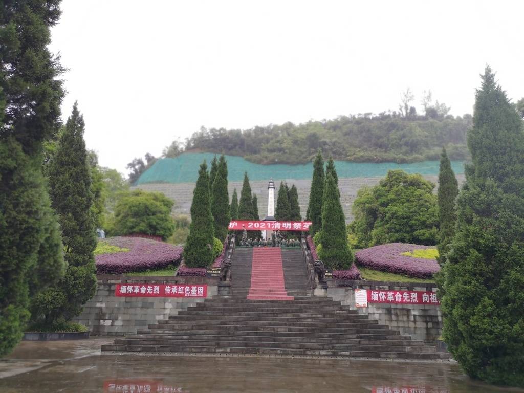 4月2日16时,四川在线记者来到达州红军烈士陵园,淅淅沥沥雨中,走进陵园大门望向园内,以石阶为中轴,两旁挺拔的松柏郁郁葱葱,气氛凝重严肃。拾级而上,直达高耸的革命烈士纪念碑。