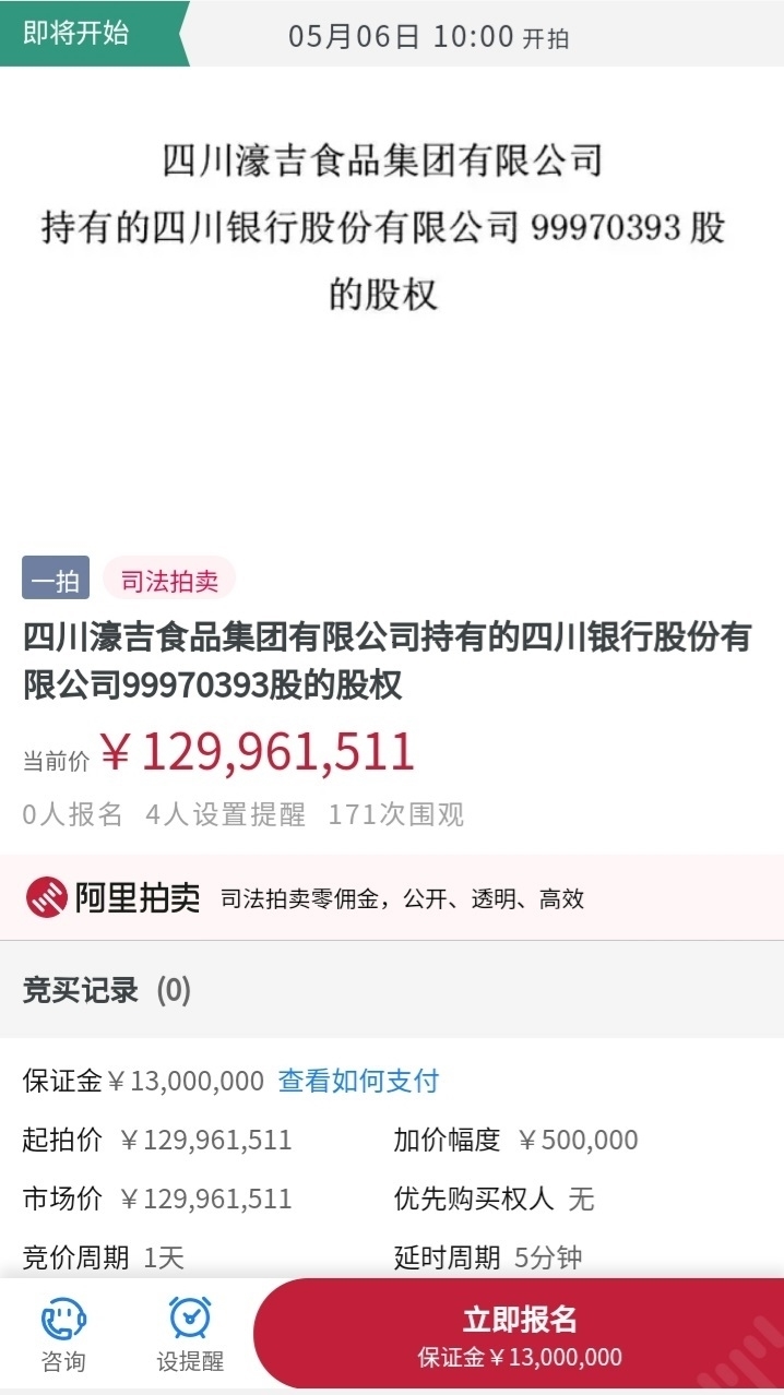 近日,四川省中级人民法院公告称,定于5月6日10:00时至5月7日10:00时,对四川濠吉食品集团有限公司持有的四川银行股权在淘宝网司法拍卖平台公开,涉案财产99970393股,起拍价为12996.1511万元。折算后起拍价约1.3元/股。参与拍卖需缴纳保证金1300万元,加价幅度为50万元。