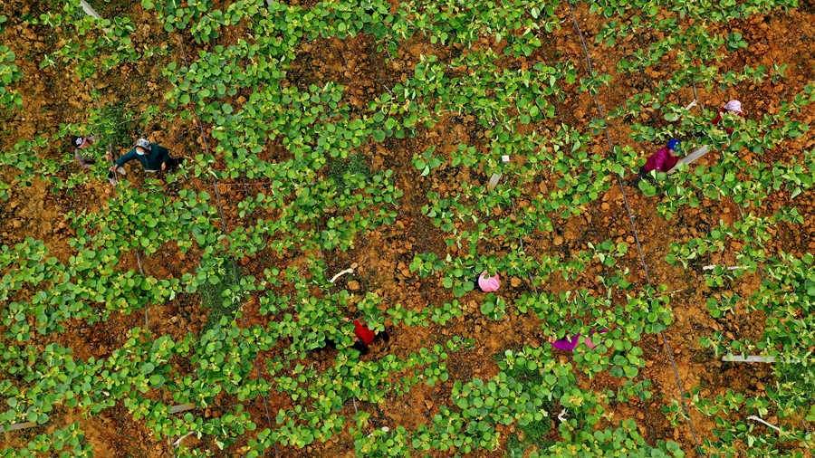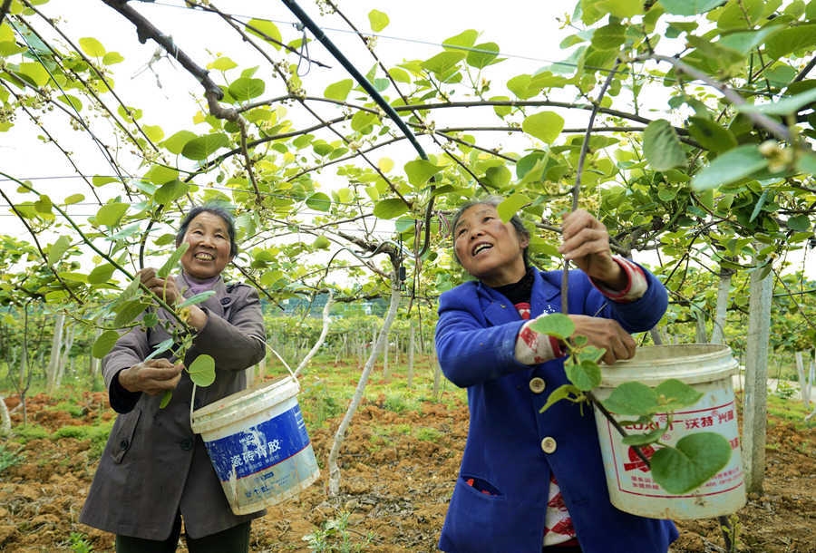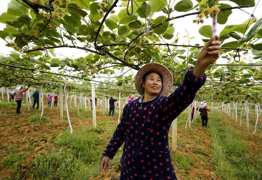 黄土镇青龙村林建猕猴桃种植基地里,村民正给猕猴桃疏花、授粉。