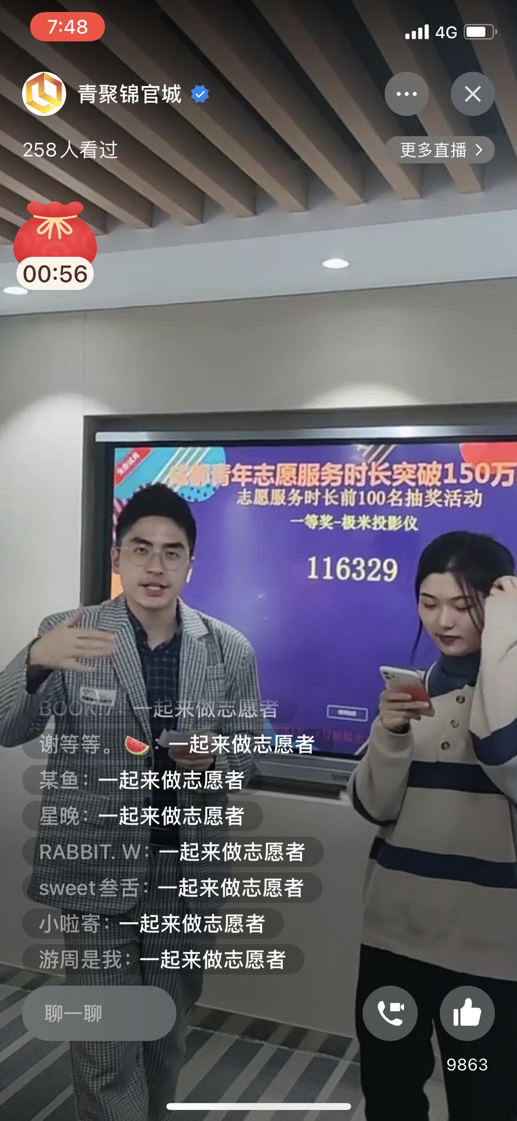 成都电视台节目主持人、青年志愿者陈翔,通过直播带领广大青年志愿者和网民朋友们,共同走进了共青团成都市委成都市青年志愿服务行动中心。向广大青年志愿者和网民朋友们详细介绍了成都市青年志愿服务从项目需求采集、网上发布、志愿者线上报名和项目实施的全过程,共同体验了社会化动员模式下,成都青年志愿服务的“触手可及”,成都青年志愿服务大数据平台的“赛博朋克”,也共同见证了成都青年志愿服务发展的蓬勃之势和成都青春力量投身城乡社区发展治理的热情。