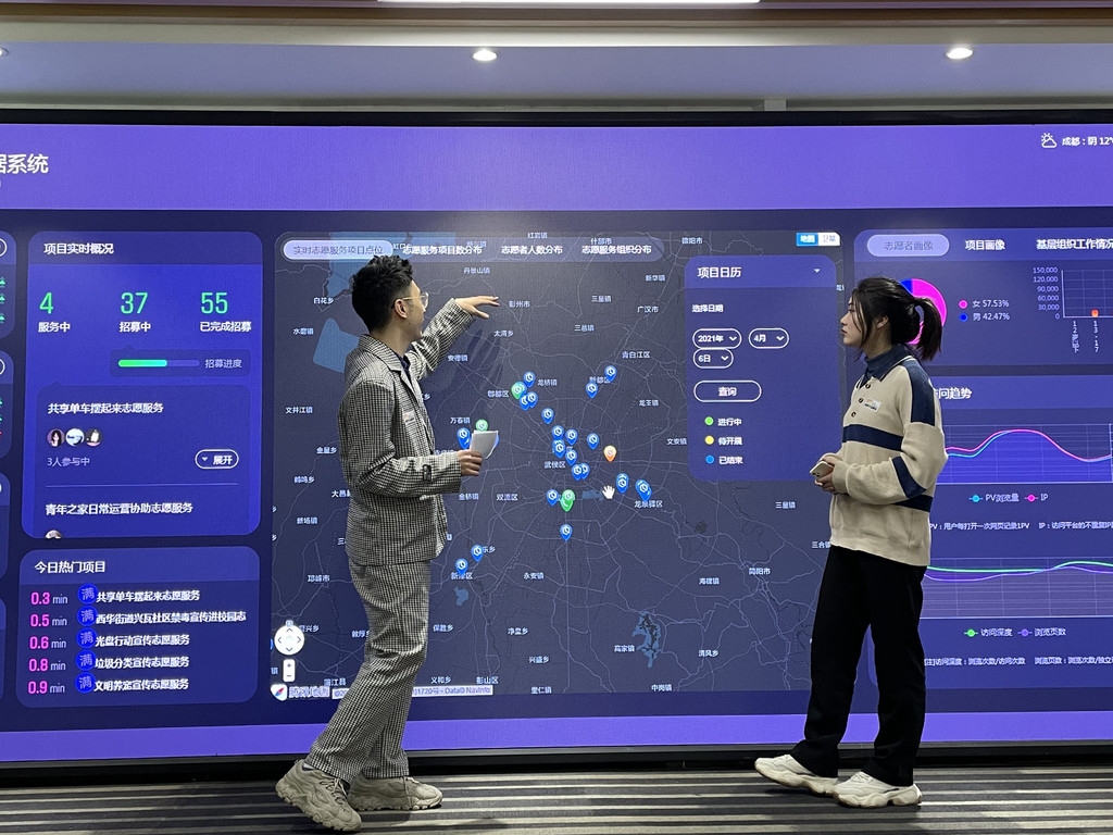 介绍完线上动员平台,在主播的引导下,广大青年志愿者和网民朋友们看到了一面巨幅的LED显示屏,上面运行着成都市青年志愿服务大数据系统。正实时化采集、全天候分析着全市青年志愿服务的关键数据,实现了志愿服务精准调度、供需及时匹配和青年对城乡社区发展治理贡献可视化呈现。