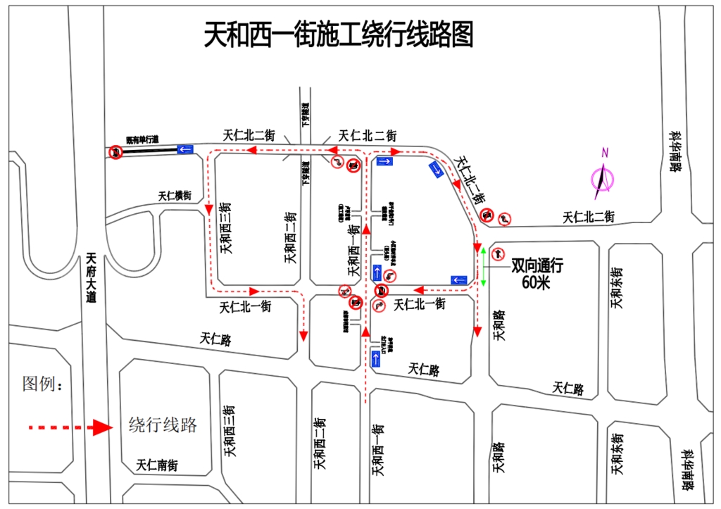 (一)原经天和西一街(天仁北二街至天仁路)由北向南行驶的机动车,可通过天仁北二街、天和路、天仁北一街、天仁路等道路绕行。