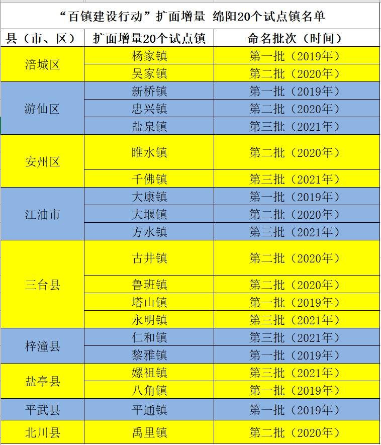 近日,省新型城镇化工作暨城乡融合发展工作领导小组印发文件,在第三批“百镇建设行动”扩面增量通过考核验收的76个新增试点镇中,绵阳市共有6个镇通过考核验收,分别是三台县永明镇、梓潼县仁和镇、江油市方水镇、游仙区盐泉镇、安州区千佛镇、盐亭县嫘祖镇。
