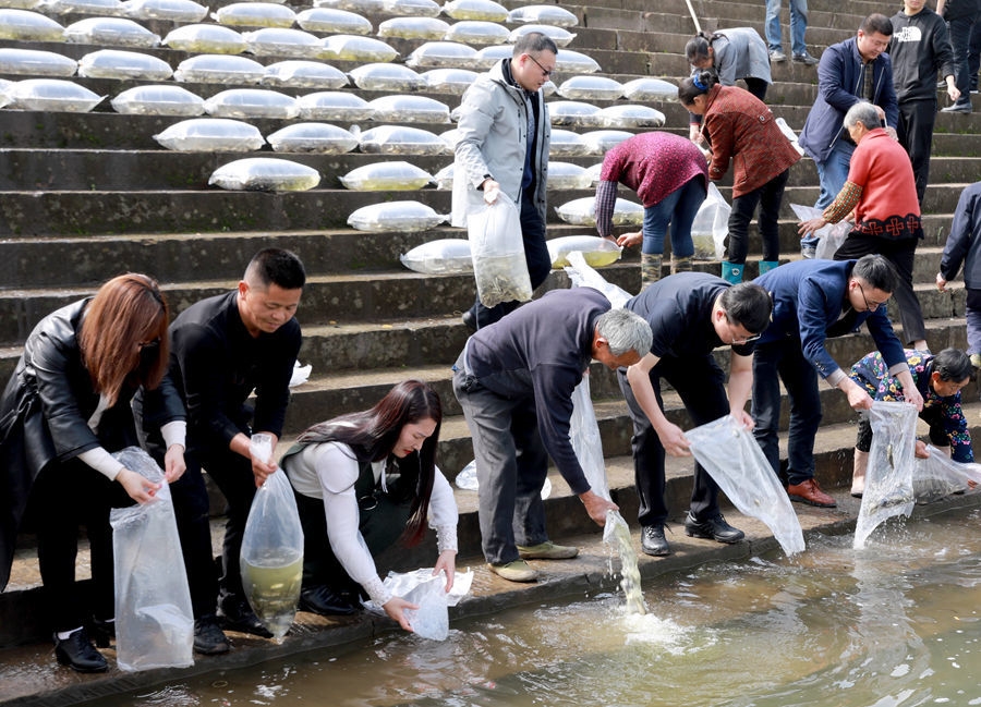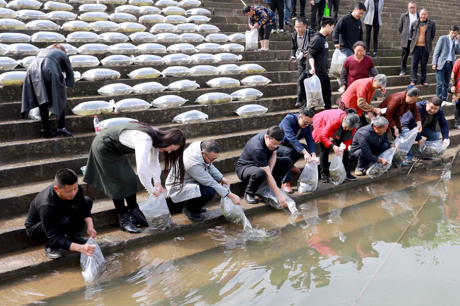 为加强长江上游水生生物资源保护、净化水质、优化水生生态环境。4月8日,四川省华蓥市举行天然水域鱼苗增殖放流活动,23万余尾青鱼、草鱼、鲢鱼、鳙鱼等四大家鱼和岩原鲤、白甲鱼等珍稀品种被放流到天然水域。