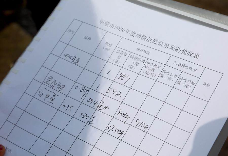 华蓥市举行增殖放流鱼苗现场,工作人员在登记放流鱼苗的数量。