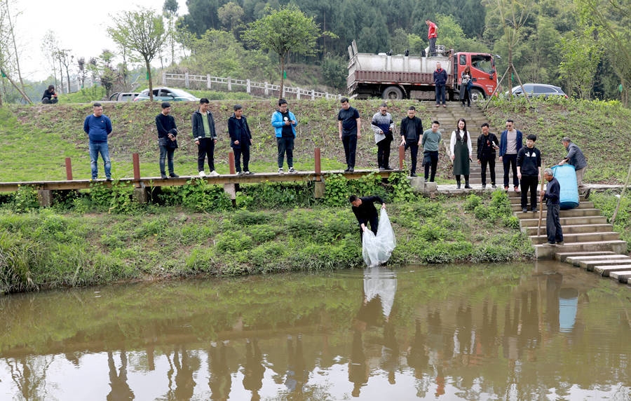 华蓥市举行增殖放流鱼苗现场,市民在放流鱼苗。