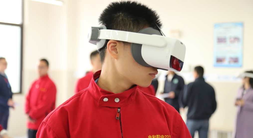 在中和职中,5G-VR虚拟实训功能已经走进了课堂,老师和学生们通过佩戴轻量级的VR一体机,就可以进行虚拟实验课程的学习,完成虚拟实验操作、物体拆解等,让课程更加生动有趣。