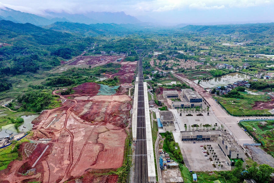 2021年4月8日,在四川省广安华蓥市航拍的正在兴建中的全国综合型物流基地和国家级煤炭储配基地——高兴货场。