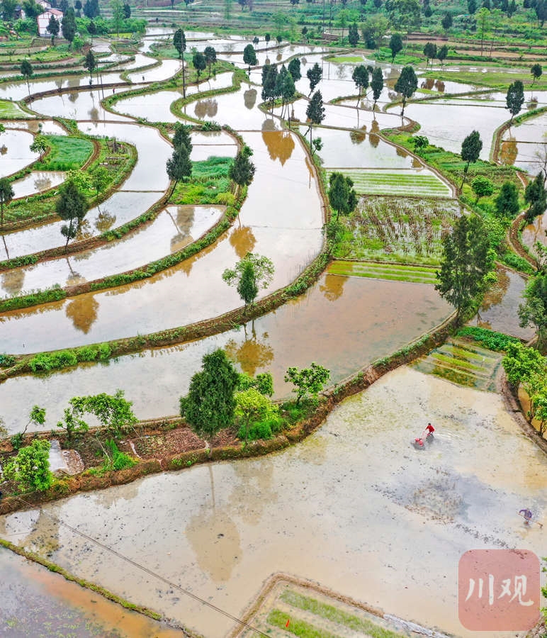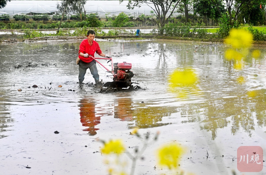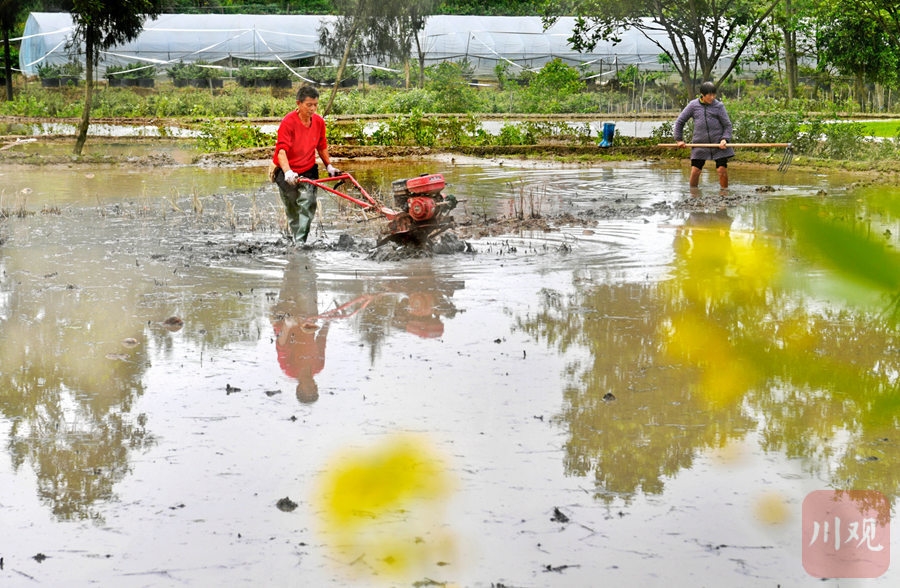 2021年4月8日,四川省广安市前锋区观塘镇白鹤村,农机社会化服务队的专业机手驾驶微耕机为村民犁田,提供代耕服务。