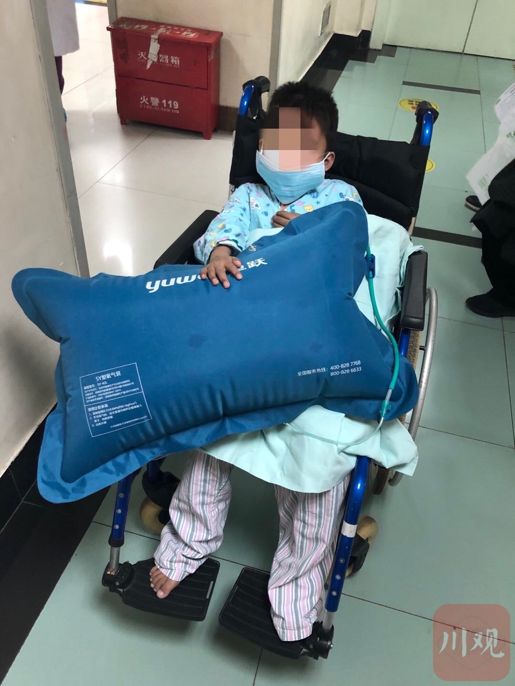 “这是昨天下午带小好文岀重症监护室做胸片检查,我偷偷给儿子照的一张。”唐全保提供的照片显示,小好文坐在轮椅上,怀抱氧气袋,鼻子里插着氧气管,面色蜡黄。“以他现在的身体状况,一路上都是无法离开氧气的。”