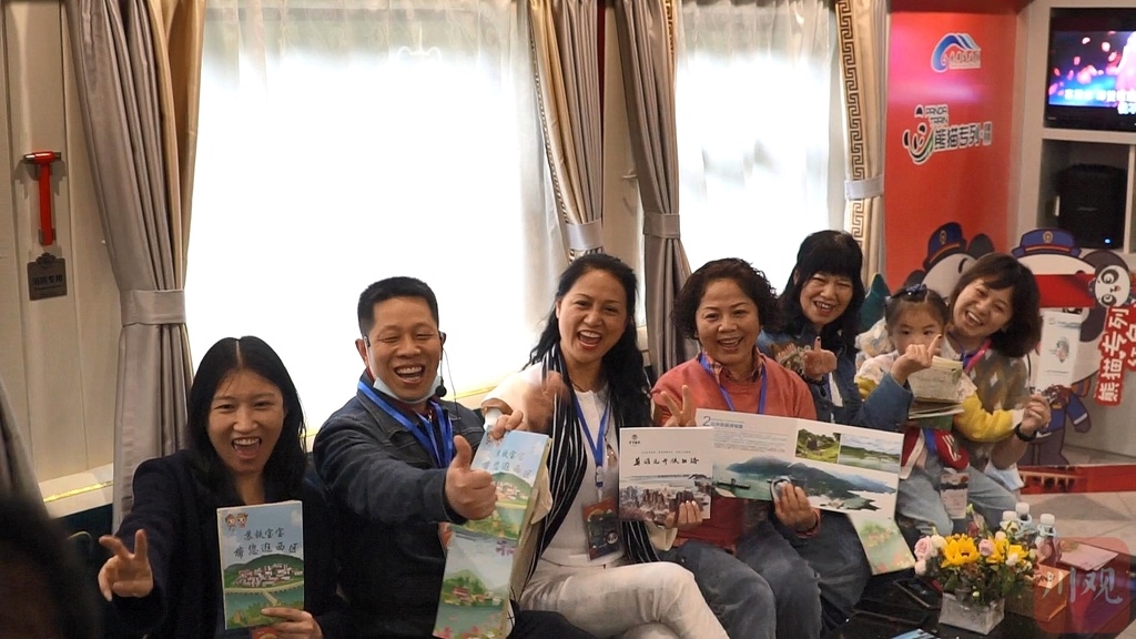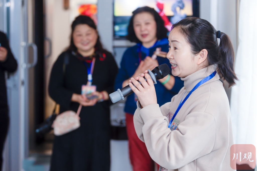 拉着同行的朋友,付梅不停的拍照“打卡”,和家人实时分享旅途喜悦。“哪里有人在唱歌?”听到车厢另一头的歌声和掌声,付梅循声而去。