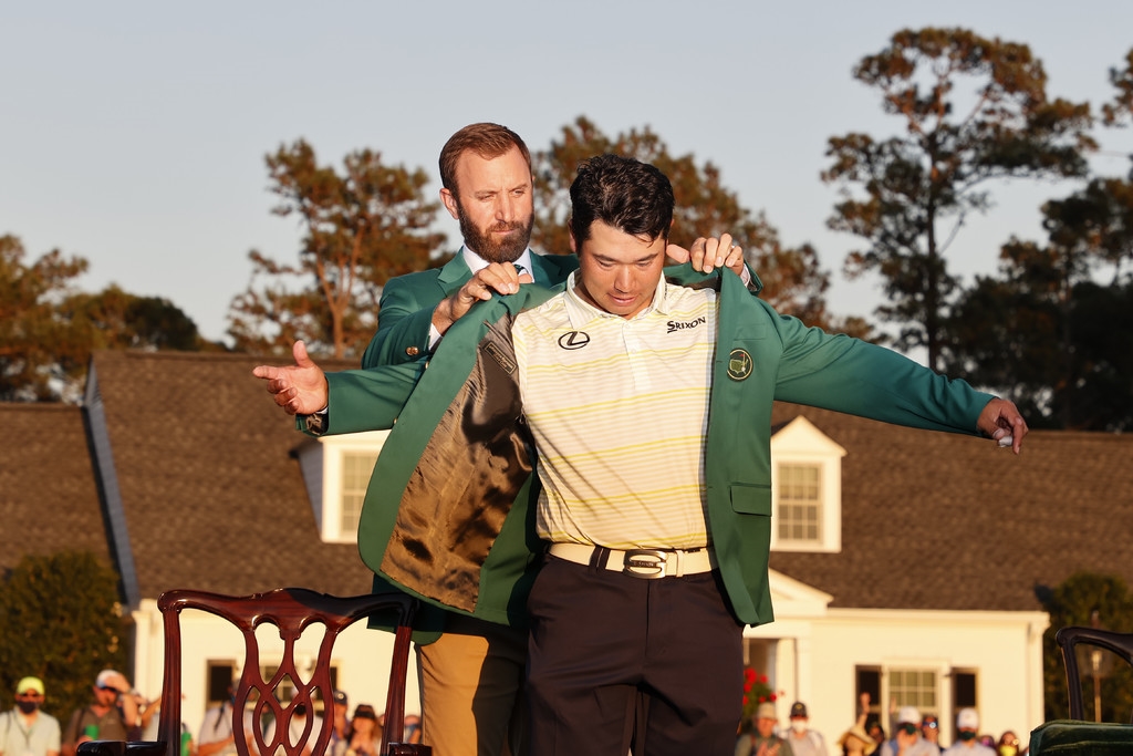 上一届大师赛冠军达斯汀·约翰逊为松山英树披上冠军绿夹克