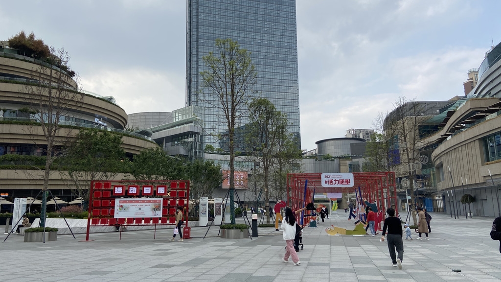 穿过琳琅繁华的商业店铺,来到露天中央广场,各类艺展区呈现在眼前,市民在这里参观、休憩、带小朋友玩耍……